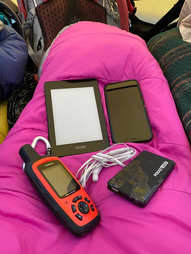 My iPhone XR goes with me everywhere, even if I’m out of service area. While I’m hiking, I use it mainly as a camera. I have found that if I put it on airplane mode, shut it off at night, and only use it for taking photos (avoid to urge to look at them until your trip is over!), I can make my battery last about 7-8 days. I also keep my phone in a warm pocket all day and in my sleeping bag with me at night if it’s supposed to be chilly to preserve the battery.