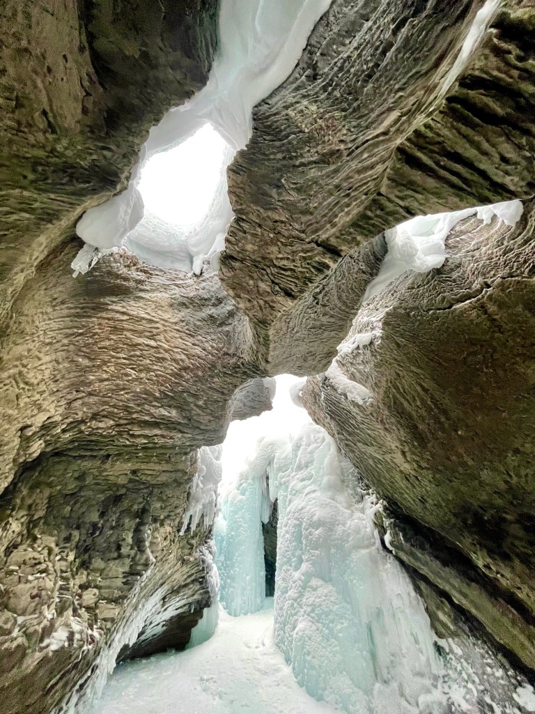 I have visited this spot quite a few times, but usually only in warmer months. The bright blue water that rushes and swirls all summer freezes in to a peaceful ice cave when the temperatures drop.