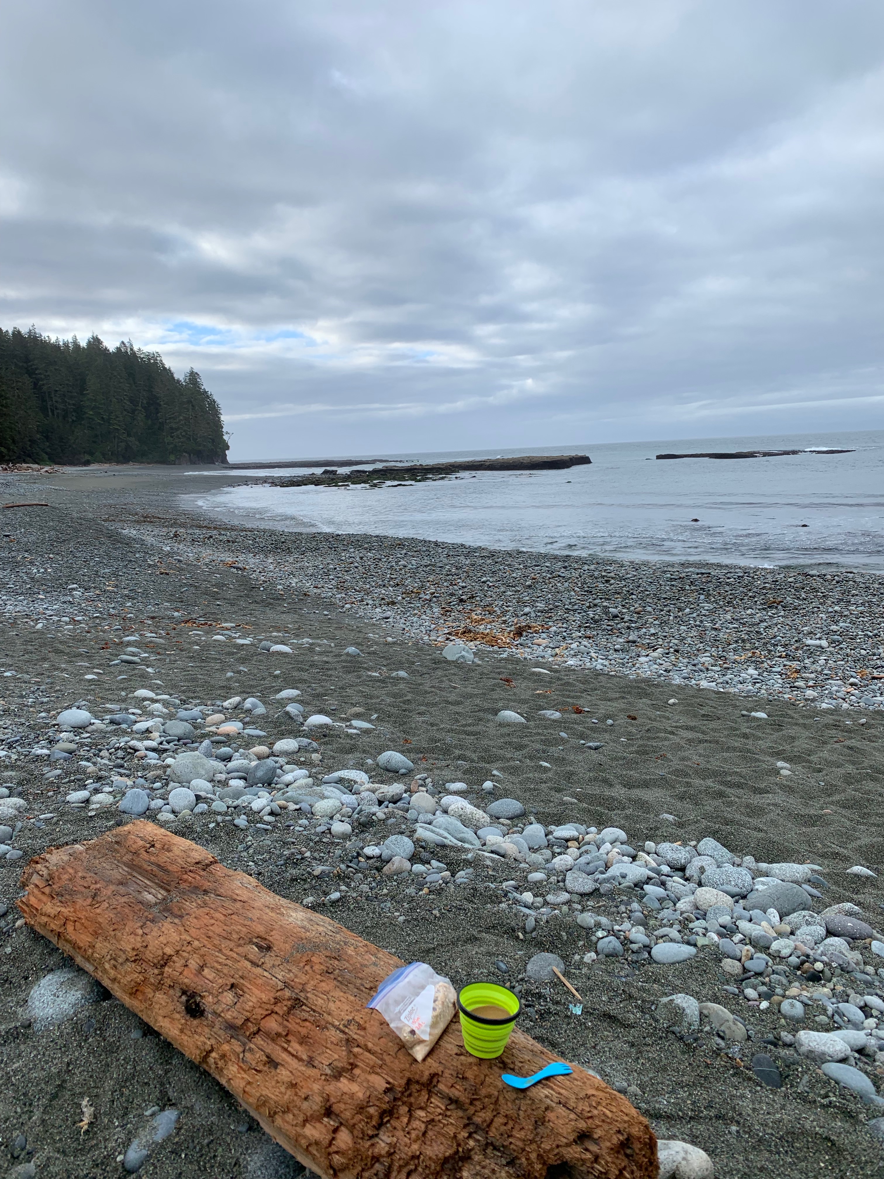 Lunches were also cold so we didn’t have to stop on the trail and unpack the jet boil. We had trail mix, granola bars, beef jerk, crackers, and fruit leather. On the fourth day we reached the Nitinaht Narrows around lunch time and were able to enjoy some fresh food. It was expensive, but well worth the price in the middle of a long 17km day of hiking.